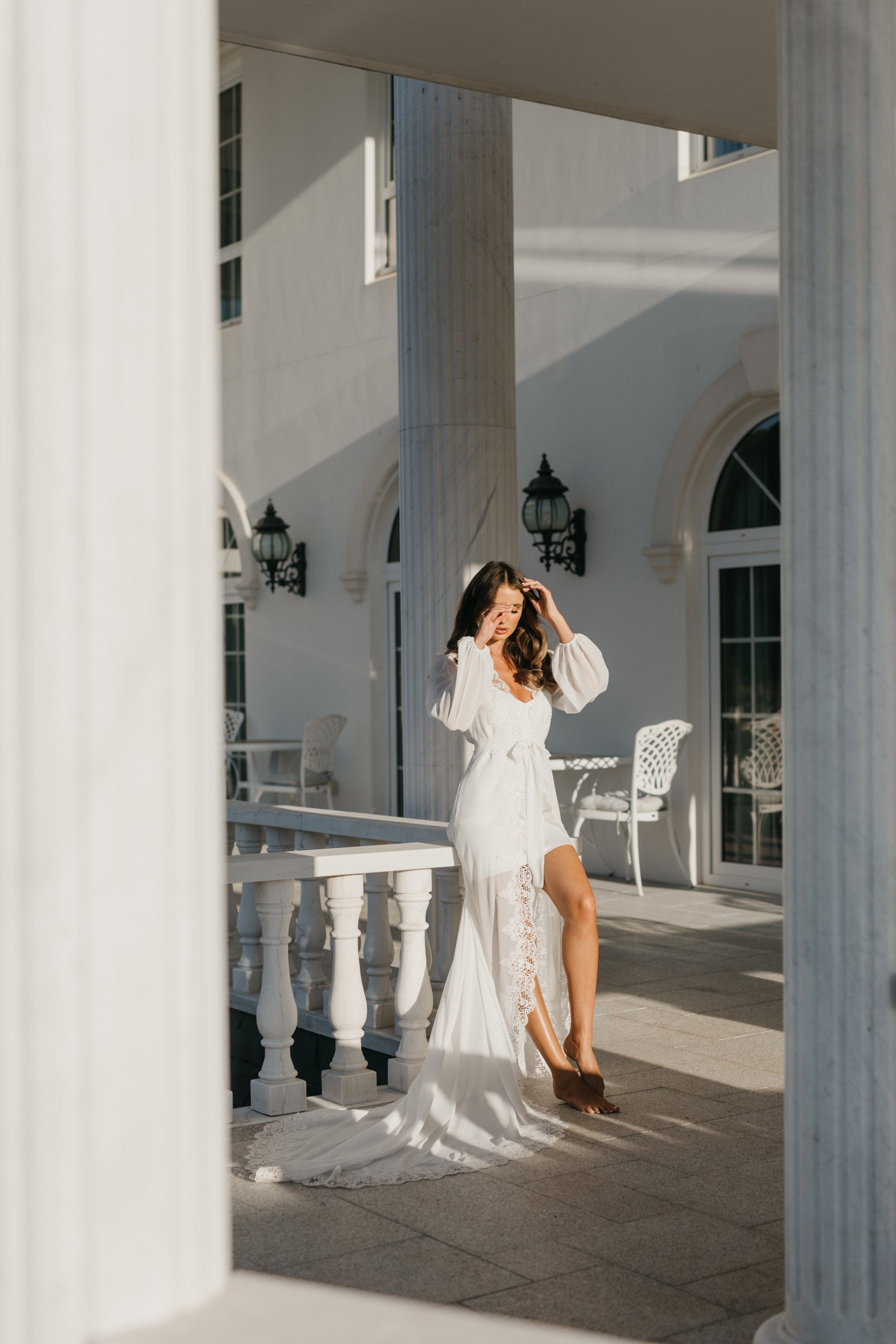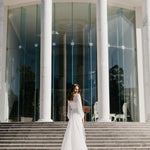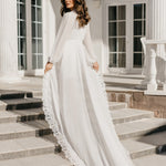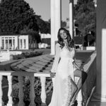 Expertly crafted from our exclusive georgette fabric and adorned with our exclusive floral lace trim and show stopping extended train. You will be the star of your own romance.