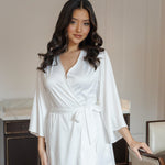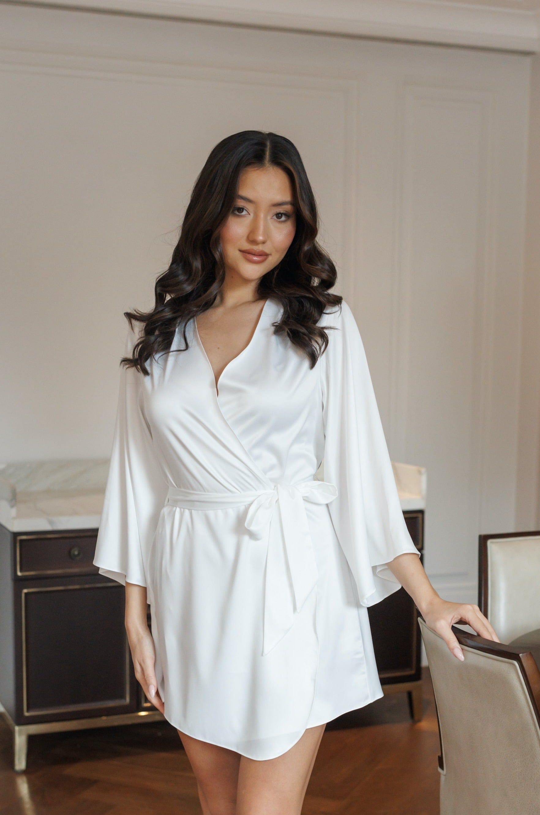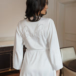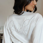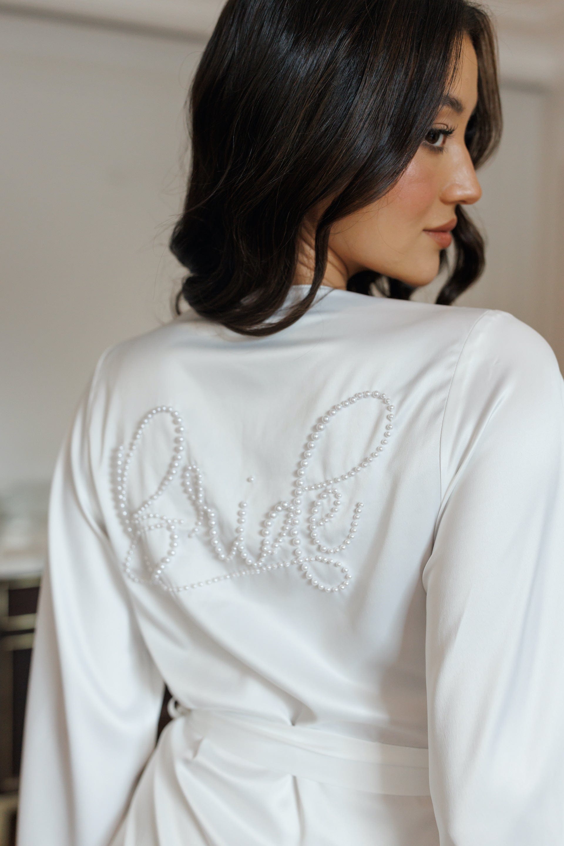 Shout it from the rooftops - She's tying the knot! Unleash sophistication in our Aimee Pearl Beaded Bride Robe. Featuring hand beaded pearl 'Bride' at the back and combining a timeless silhouette with chic angel sleeves and a graceful petal hem, the Aimee brings together traditional and modern fashion in a flawless union.
