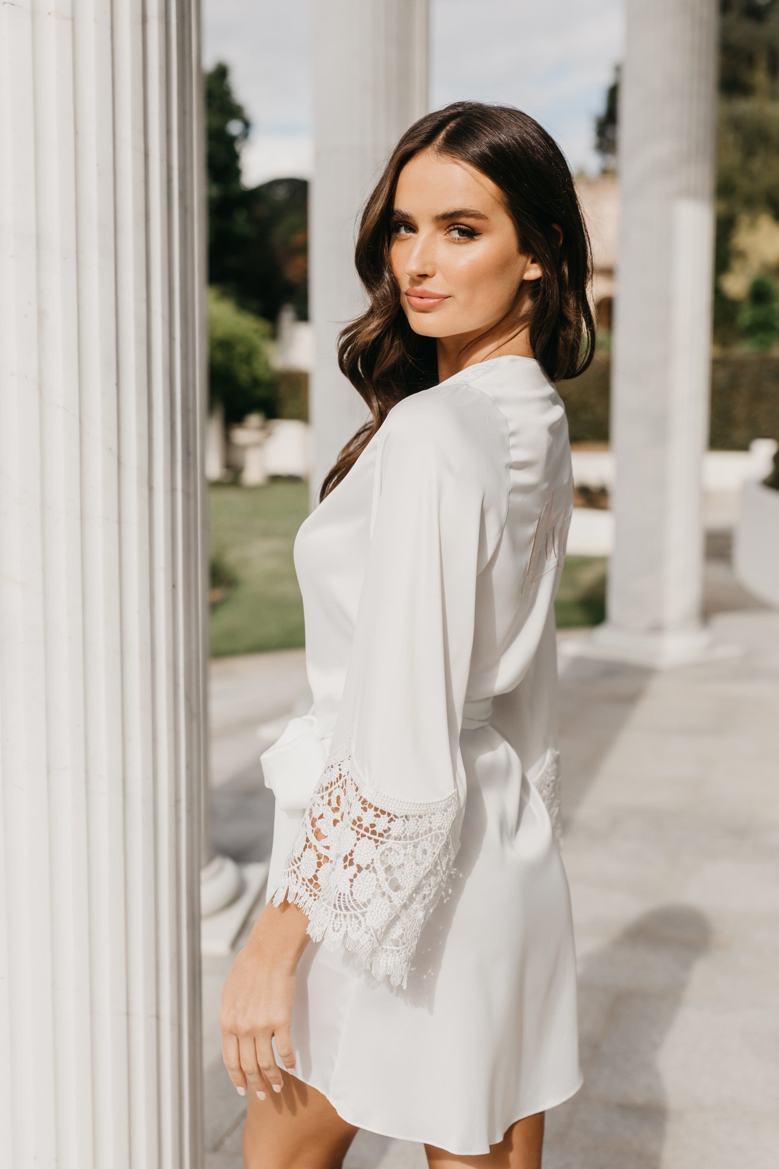 Our Scarlett Petal Hem Satin Trim Robe will set your heart a flutter with enchanting lace sleeves featuring our exclusive Blushing Haze lace trim. Designed in house at LeRose HQ, our Blushing Haze lace will steal your heart again and again... Available in 3 dreamy colours personalise yours today on the front or back. Pair with the Clementine Pearl Beaded Maxi Bridal Robe for perfectly matched bridal party styling.