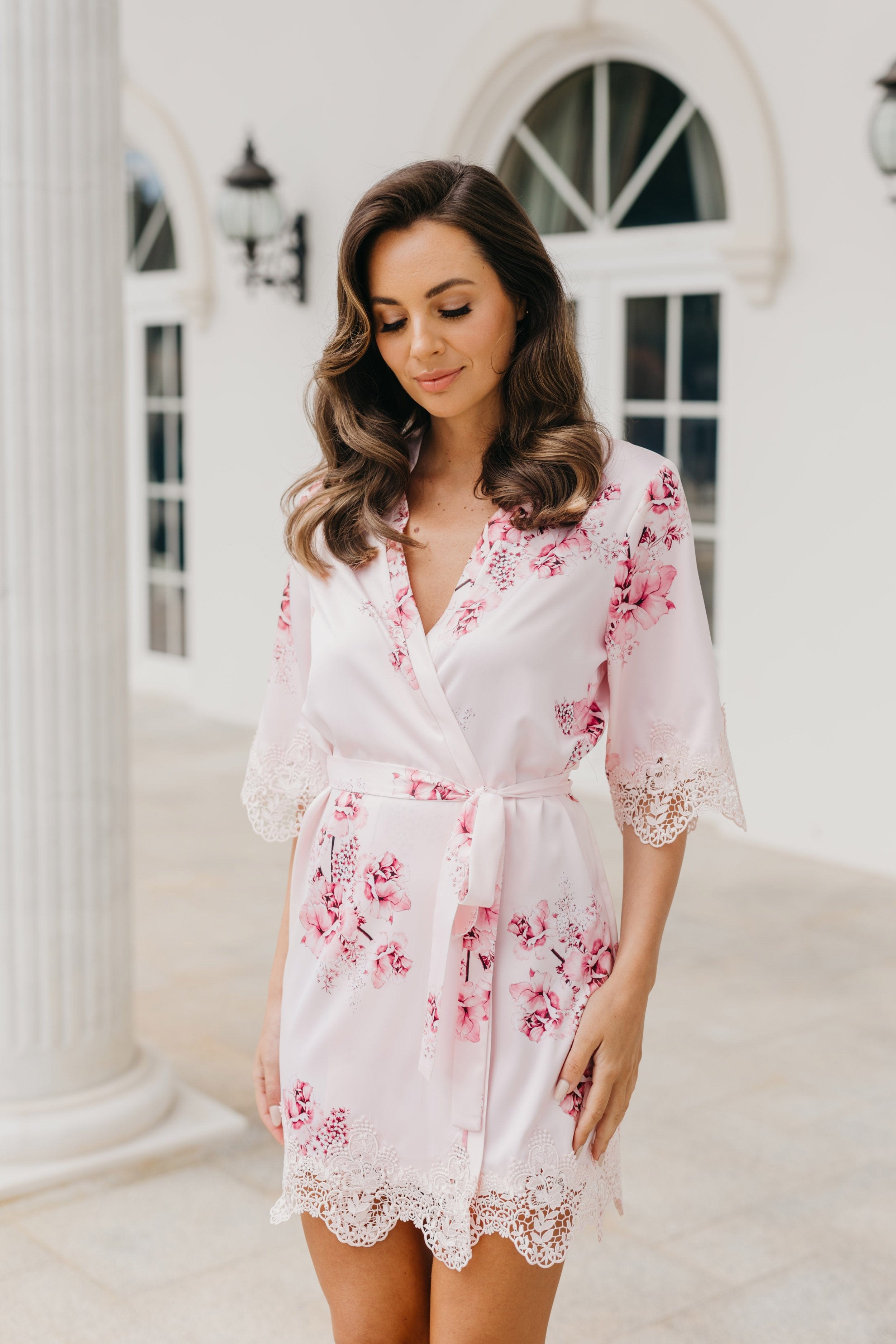 Wrap yourself in our exclusive 'Bouquet De Fleur' floral design printed on our Le Rose satin fabric developed by us for you. Our exclusive floral lace trim adorns the sleeve and hem.