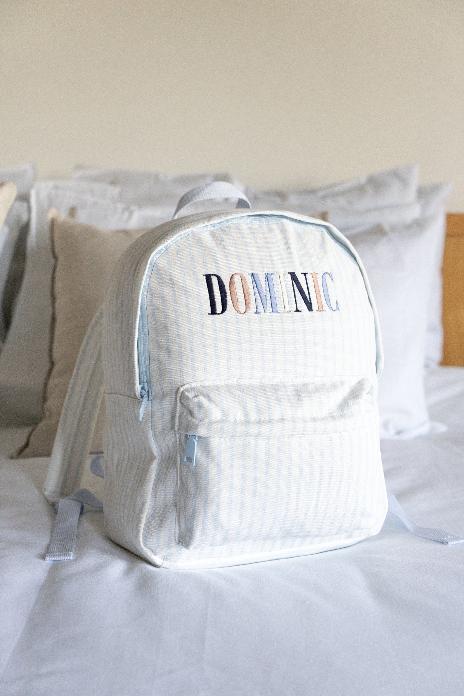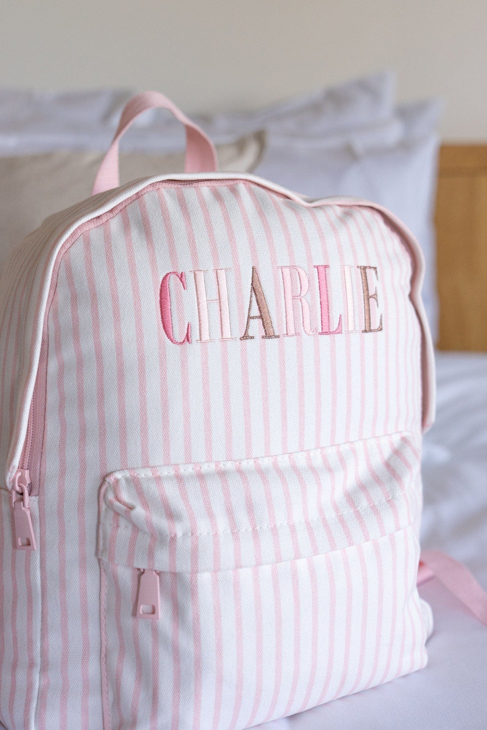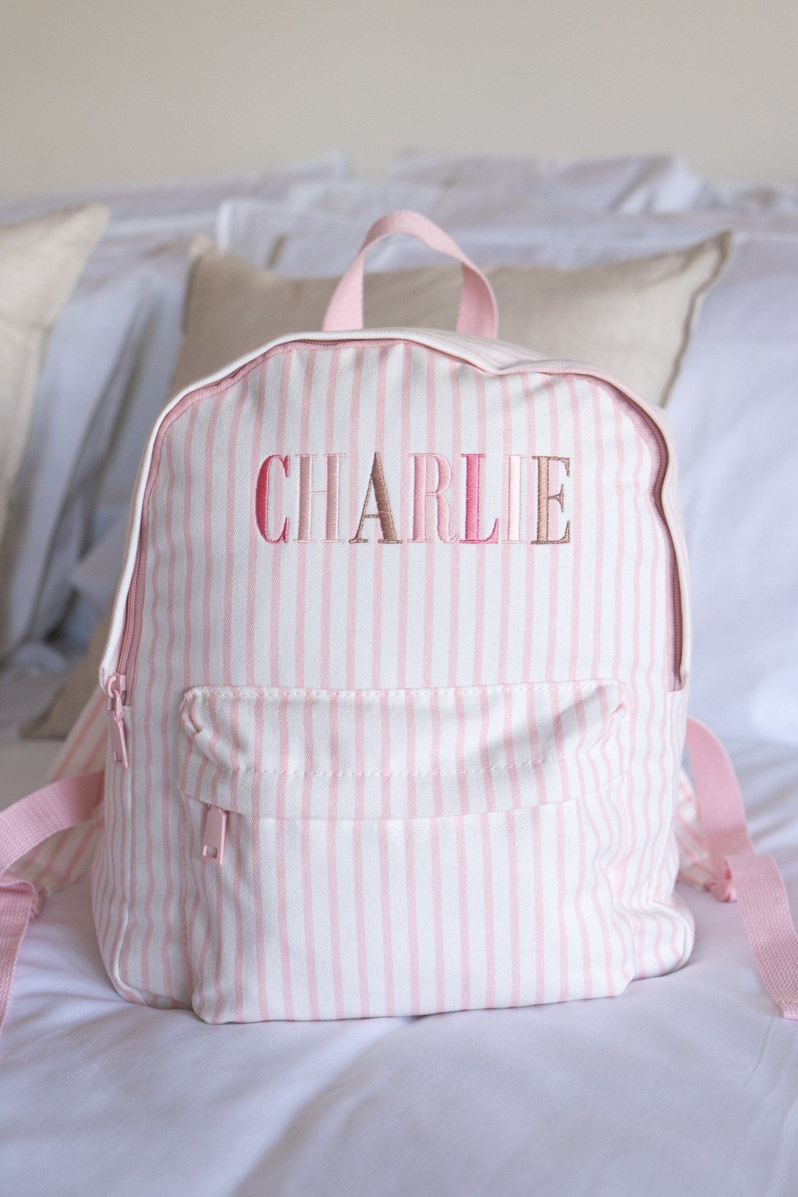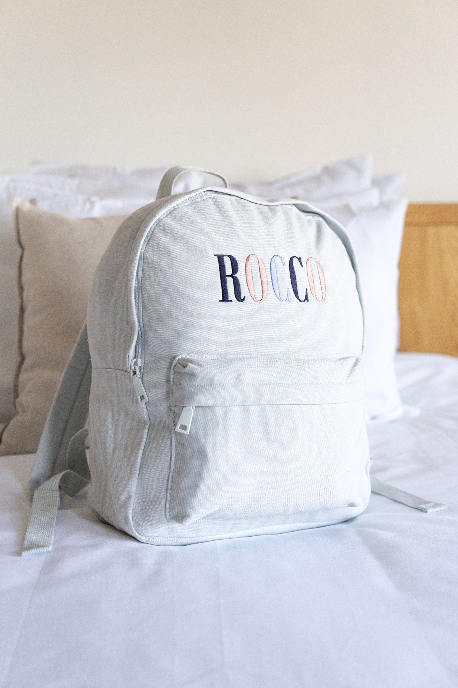 *The embroidery colours and font of each name are set as per the images above. These can not be altered and are designed to match back to the bag colour. The sequence of each letter colour will continue for names with more characters than those shown.