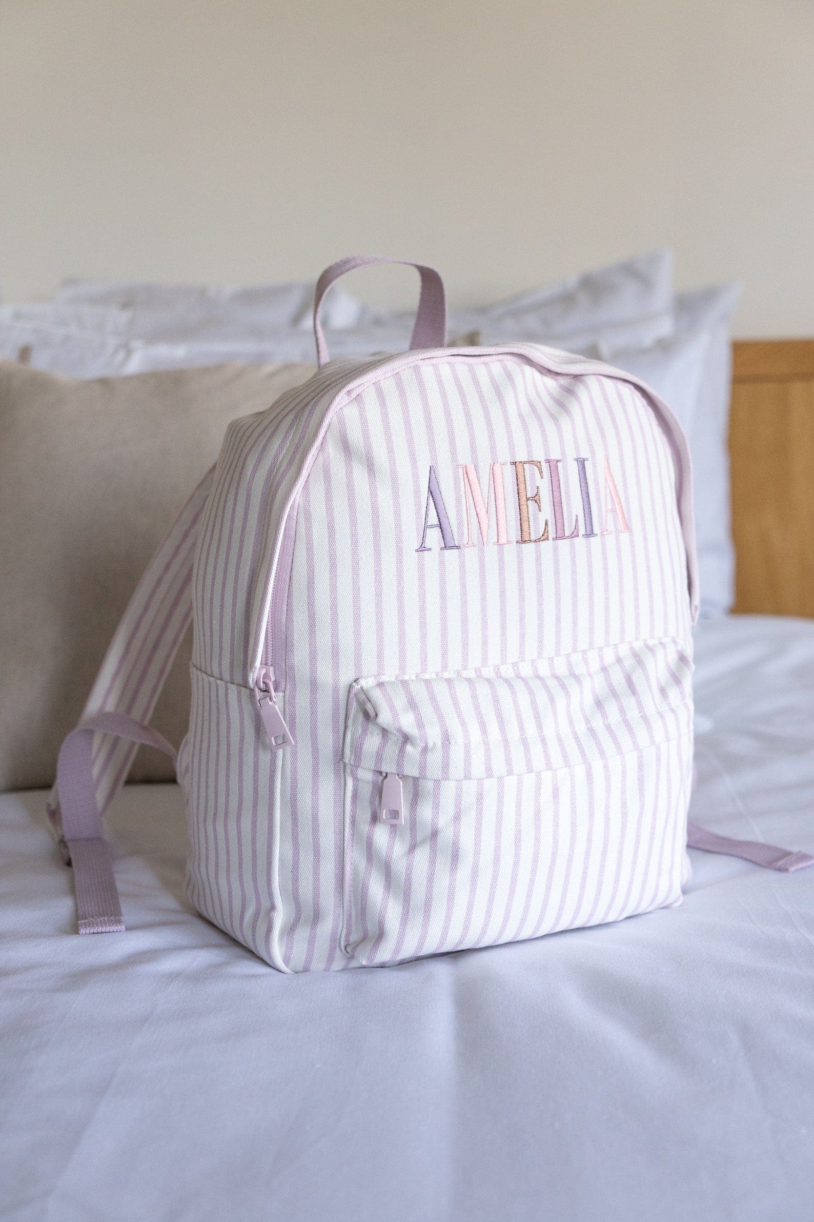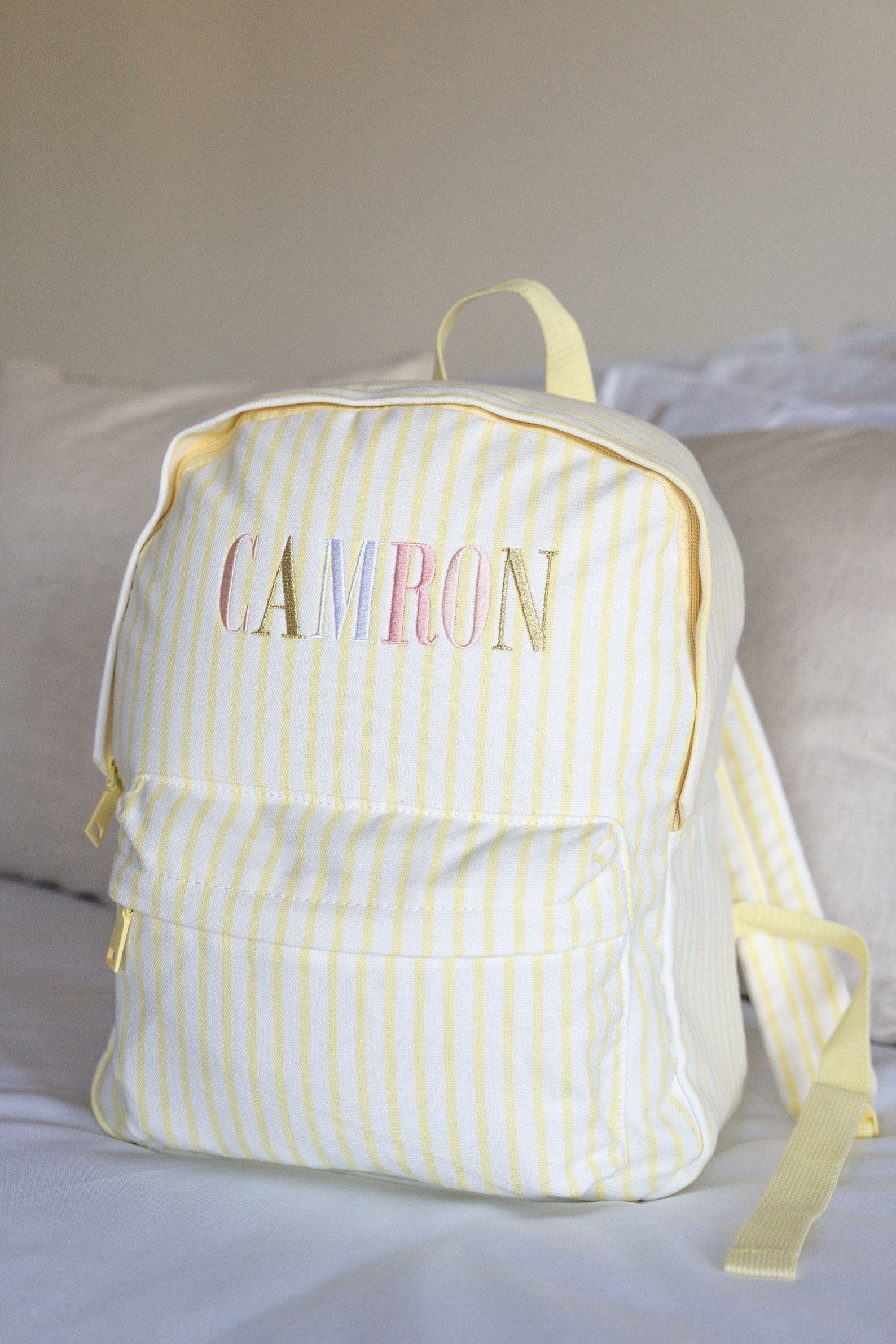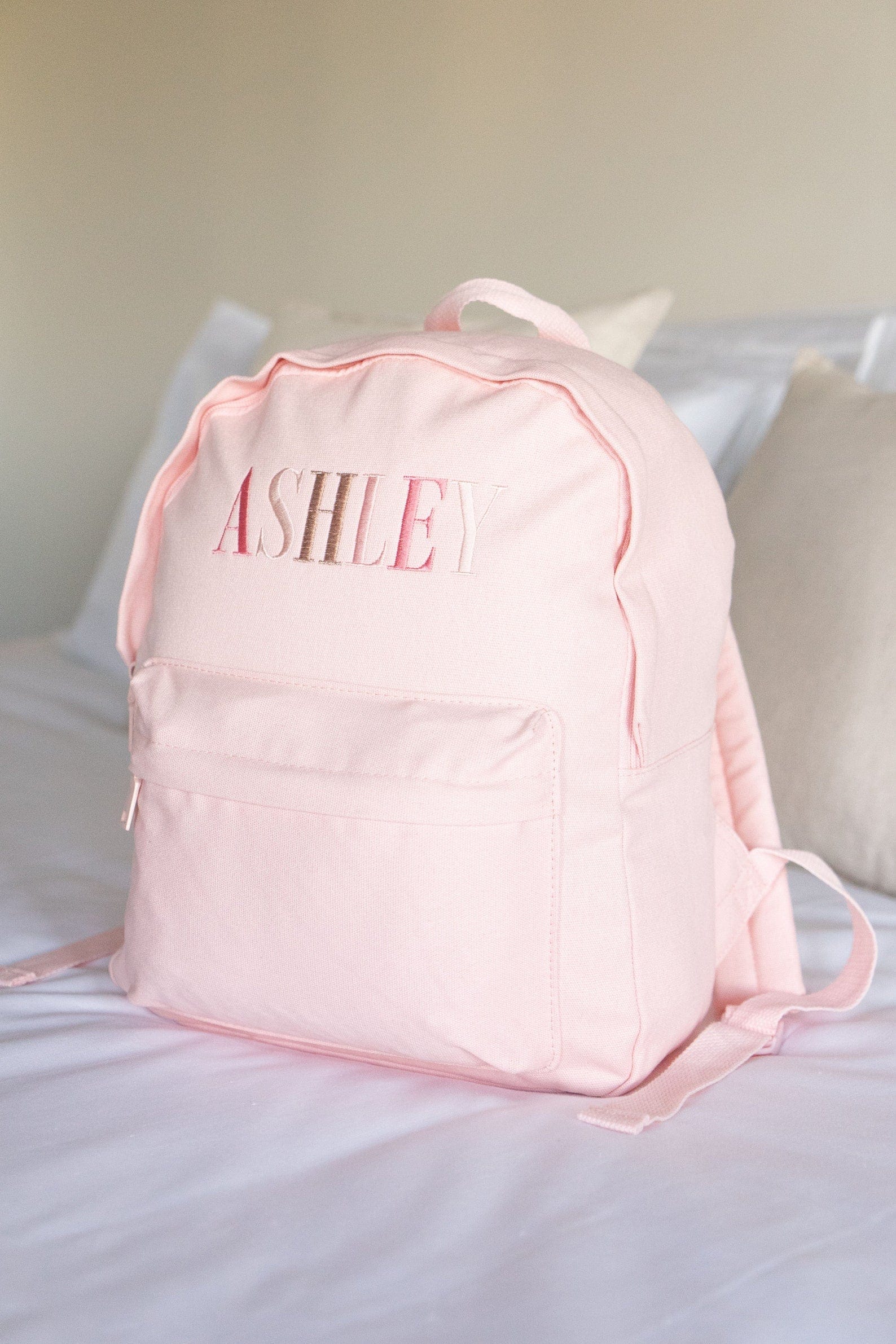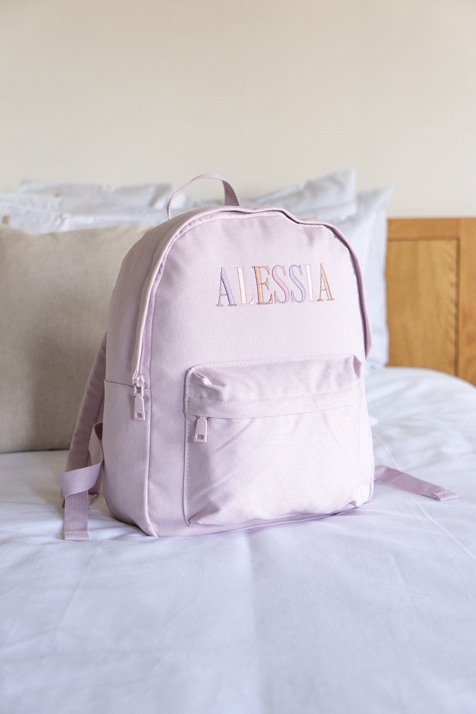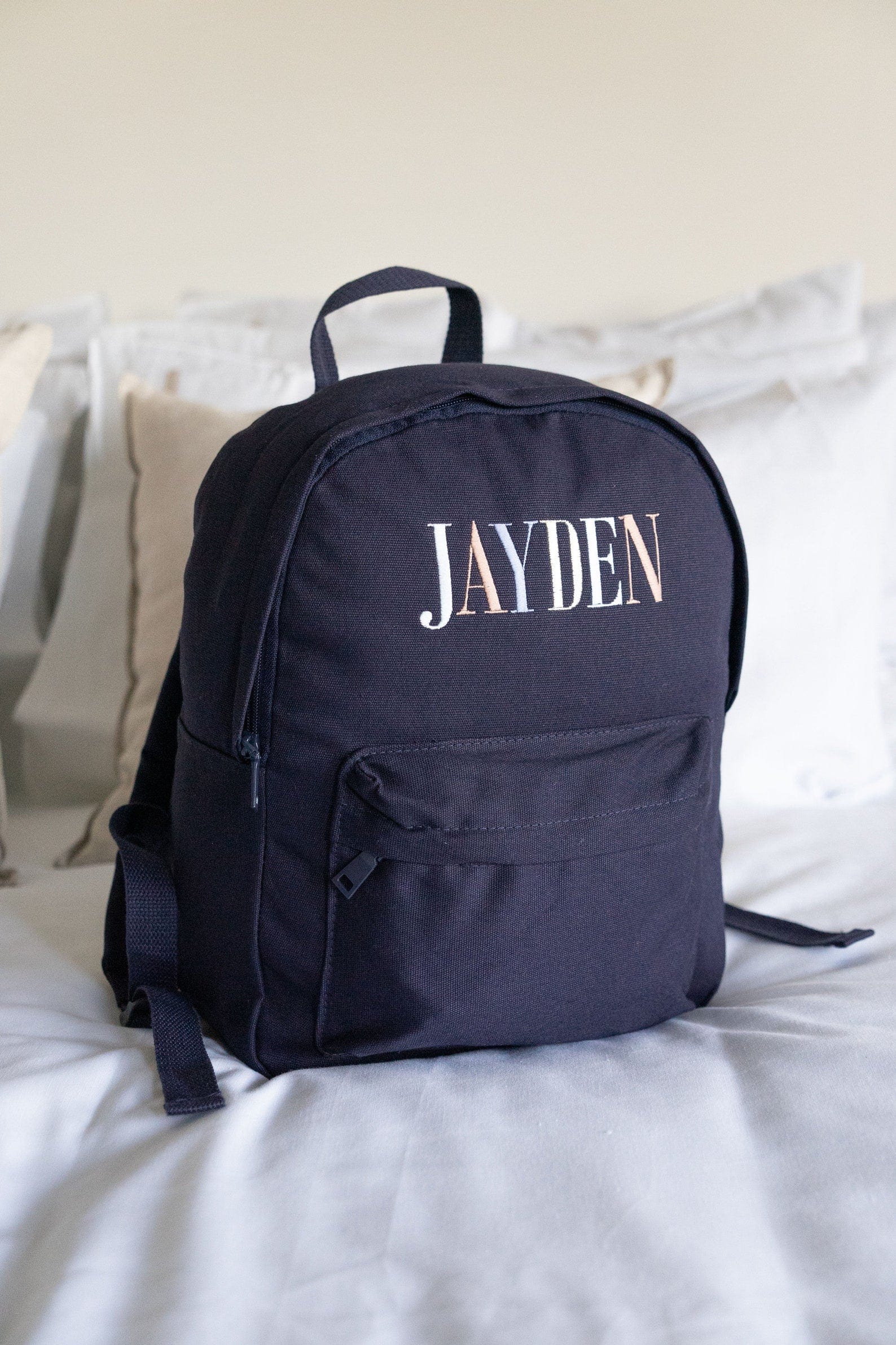 *The embroidery colours and font of each name are set as per the images above. These can not be altered and are designed to match back to the bag colour. The sequence of each letter colour will continue for names with more characters than those shown.