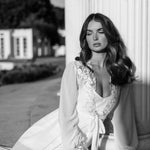 Expertly crafted from our light catching georgette fabric, adorned with our exclusive pearl beaded lace detailing, romantic blouson sleeve and features a show stopping extended train.