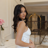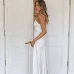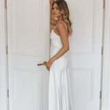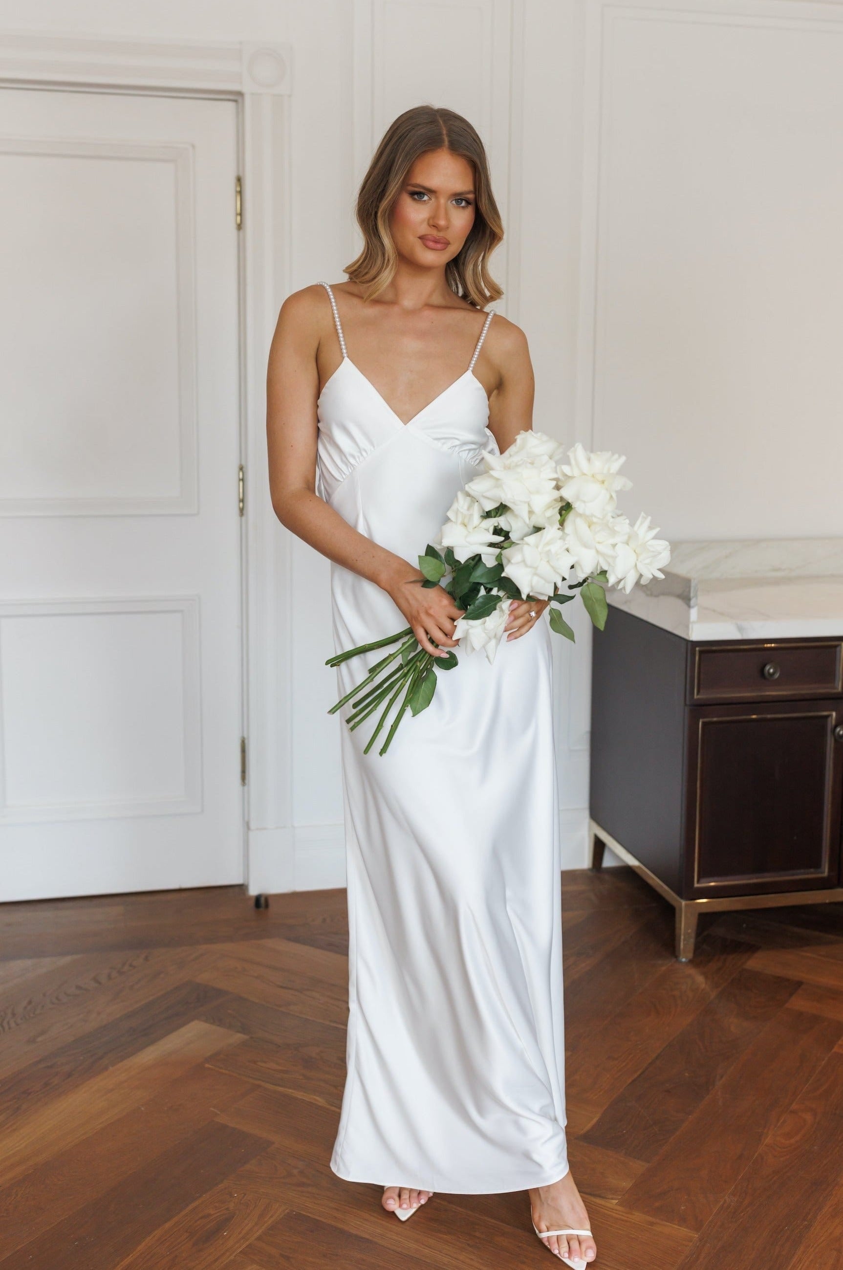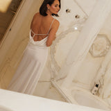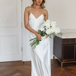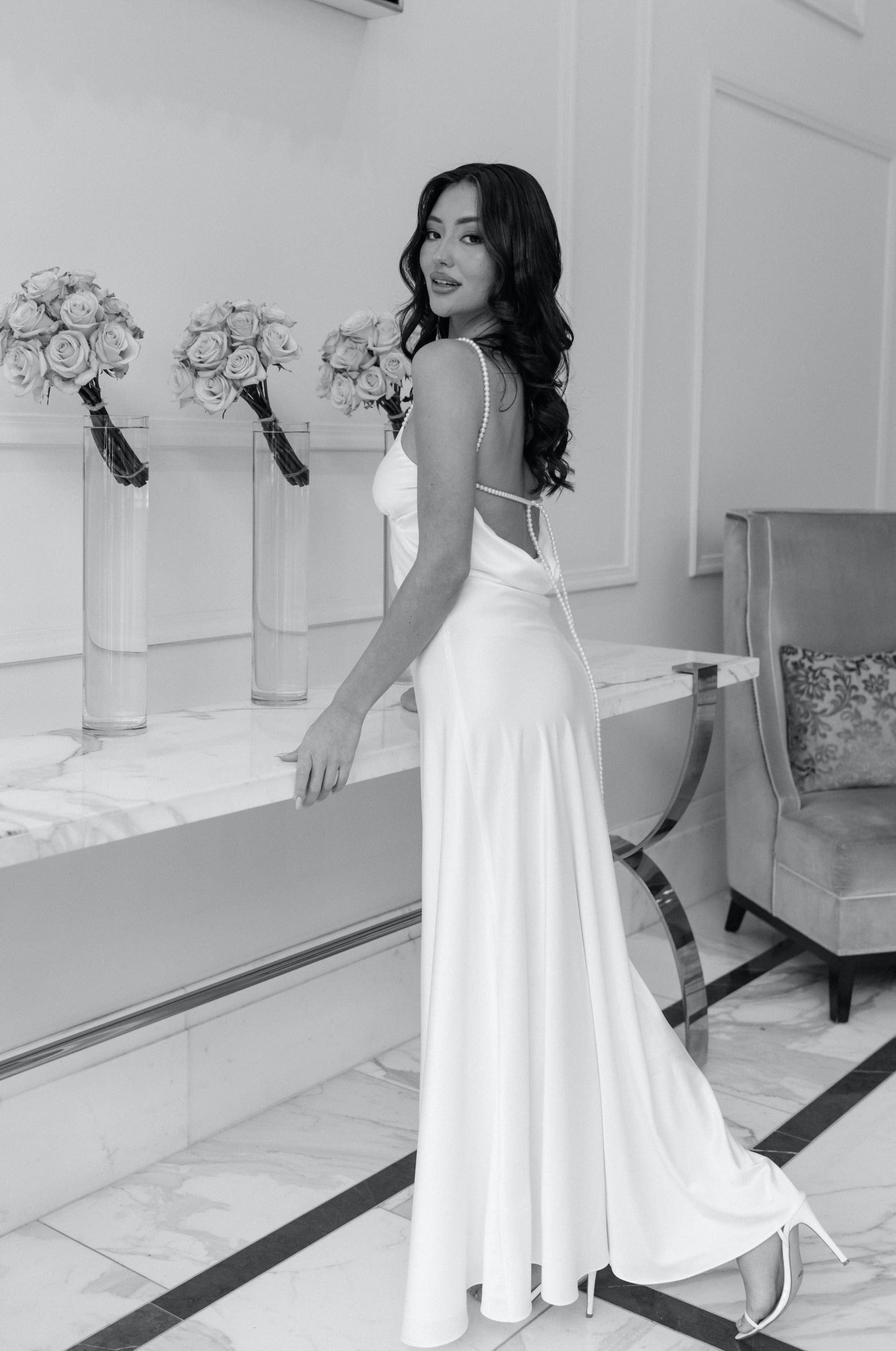 Our Lea Pearl Cowl Back Maxi Slip is adorned with the gem of queens... featuring romantic cowl detailing and modern pearl straps that tie at the back, you'll be the star of your own love story on your big day...