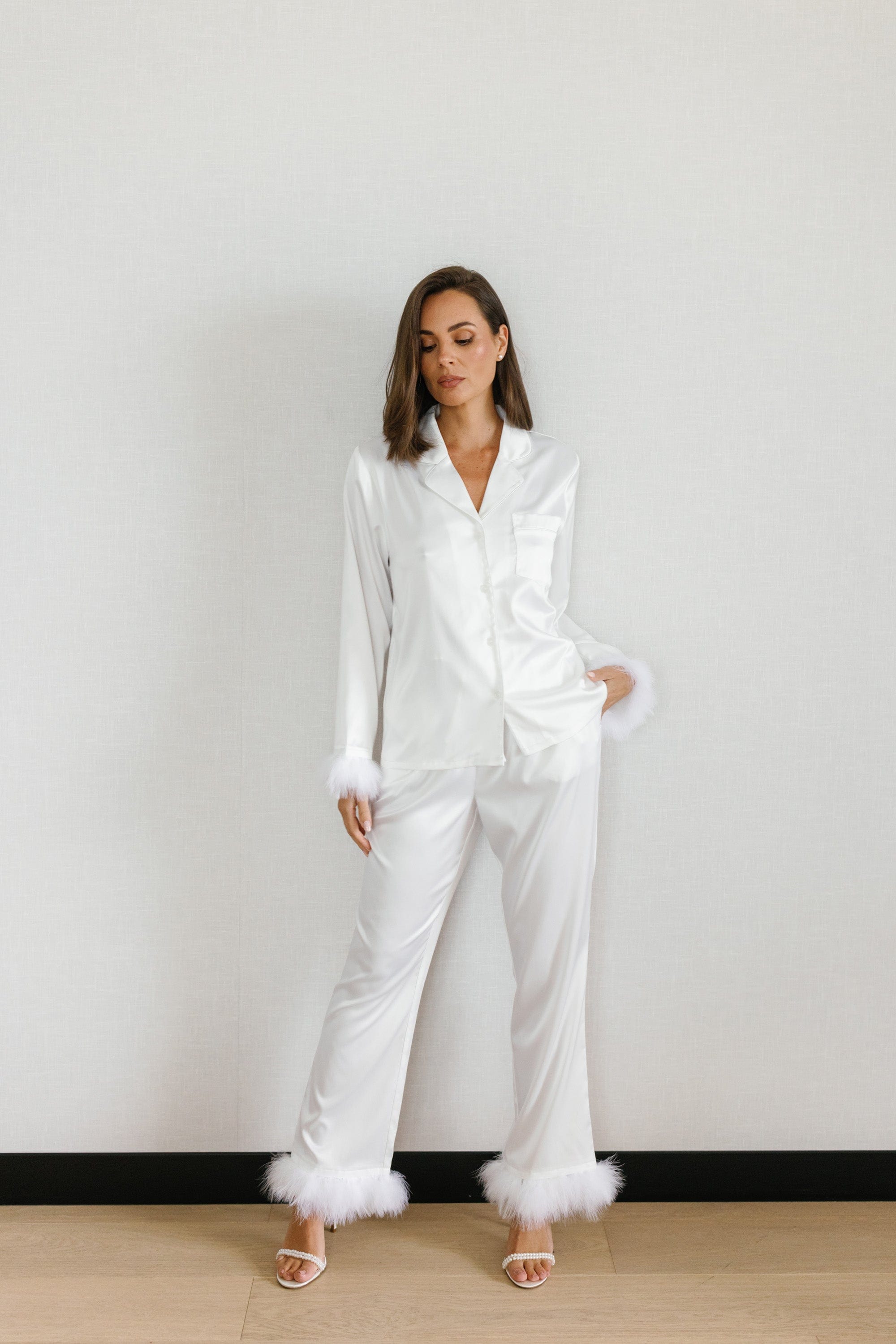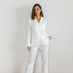 Crafted in silky satin with dreamy feather trim on the sleeves and pants, this bridal pyjama set is made for the moments that matter — from getting ready on the big day to winding down in something a little extra. Add a personal touch to make it uniquely yours.