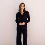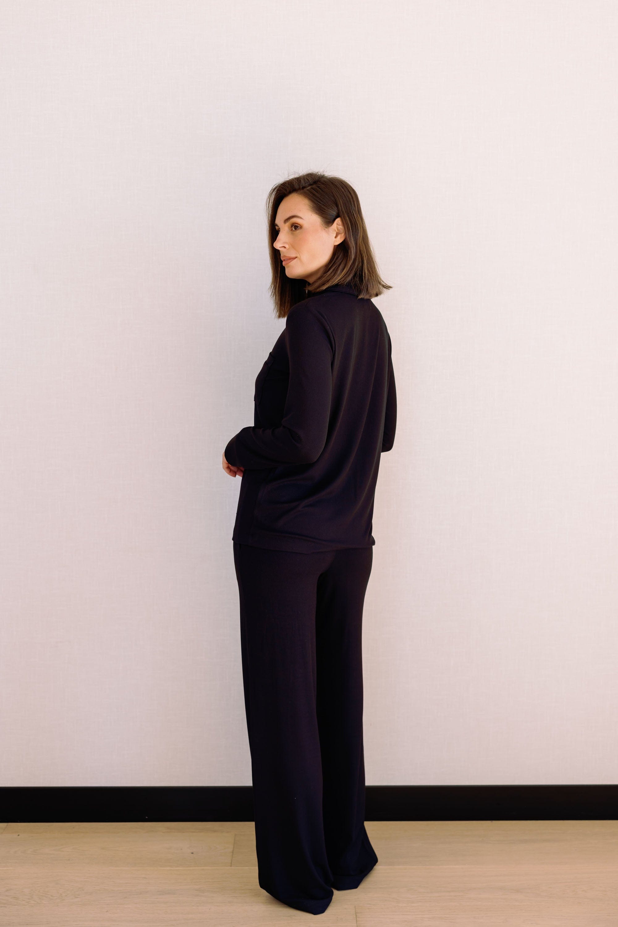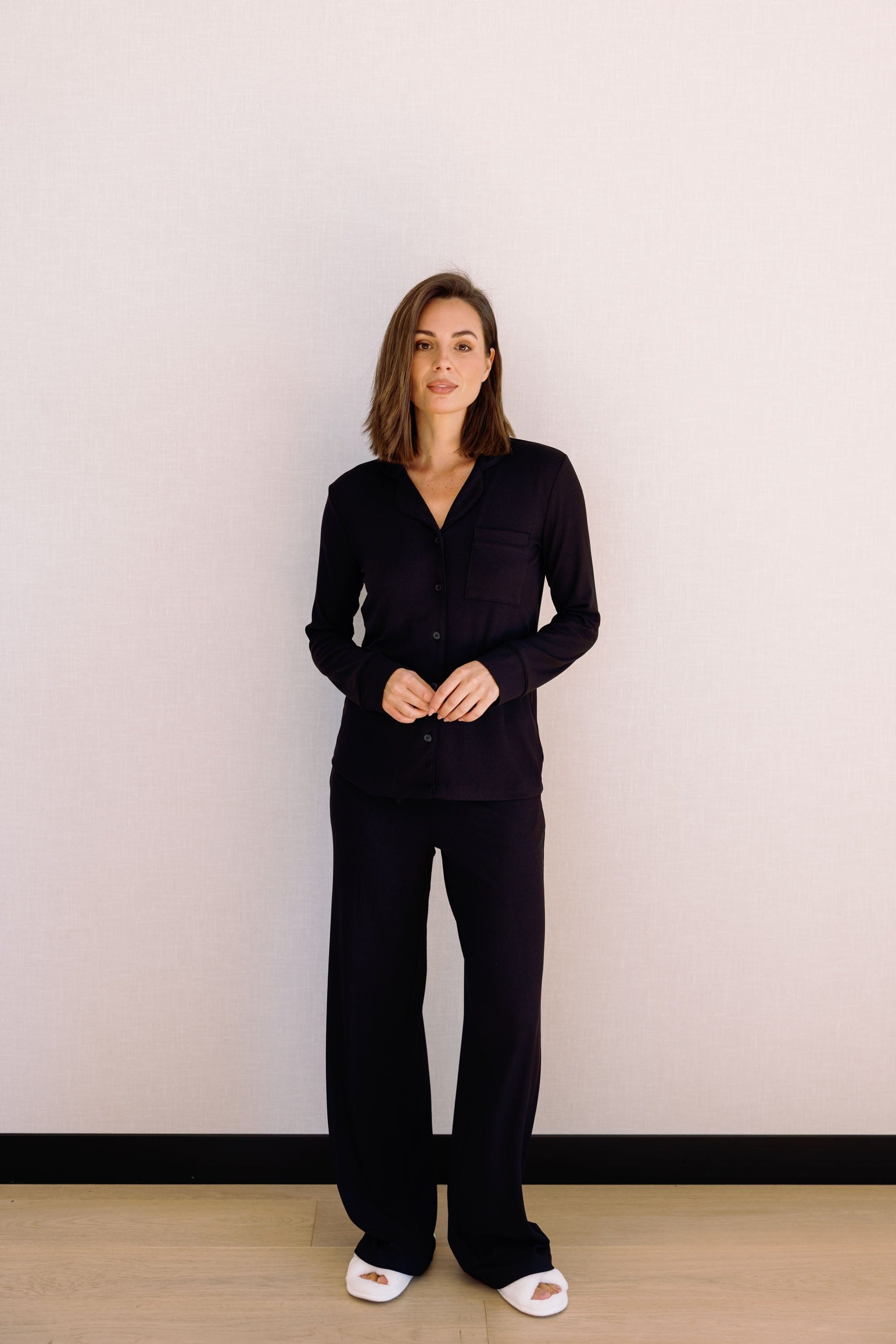 Woman wearing long ribbed modal pyjamas set in black colour – Le Rose Stories