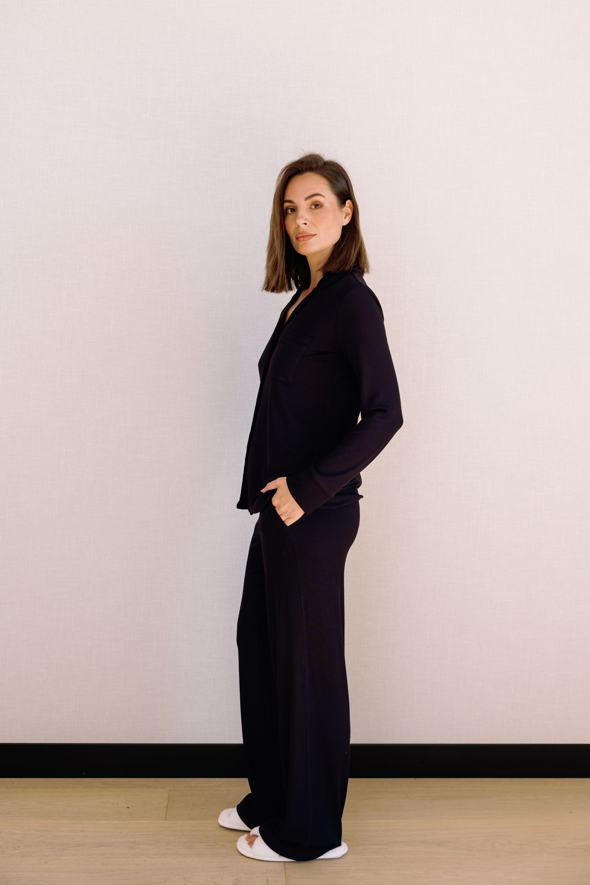 Woman wearing long ribbed modal pyjamas set in black holding a coffee mug