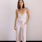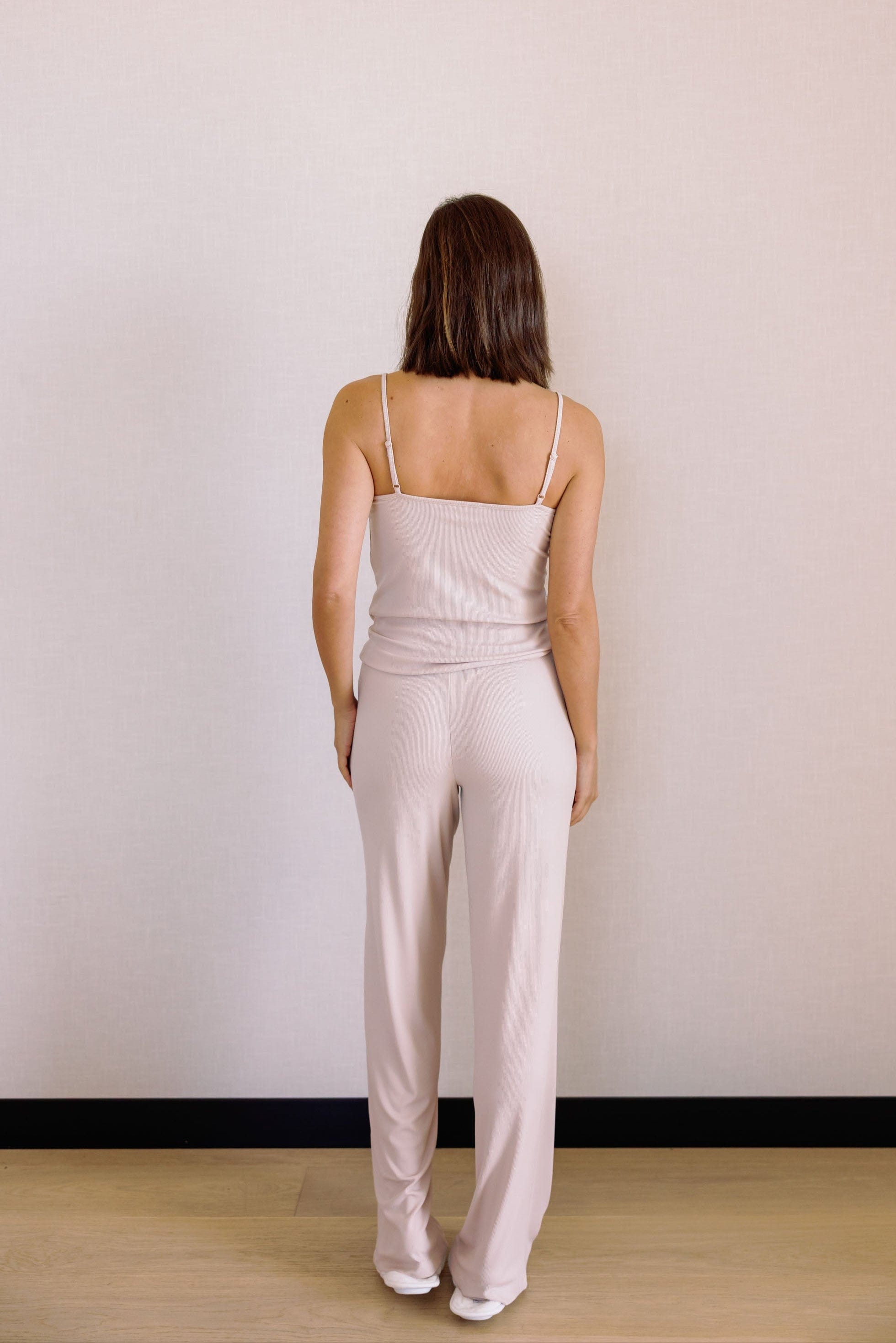 Cami features adjustable straps for the perfect fit; pants are gently relaxed and full length.
