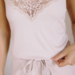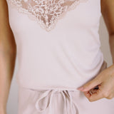 Discover the beauty of effortless loungewear with our Colette Lace Trim Modal Cami and Pant Set in Champagne. Crafted from silky modal fabric with delicate lace trim, this set combines breathable comfort with refined style. The fluid drape of the cami and full-length pants creates an elegant silhouette for sleep, lounging, or gifting.