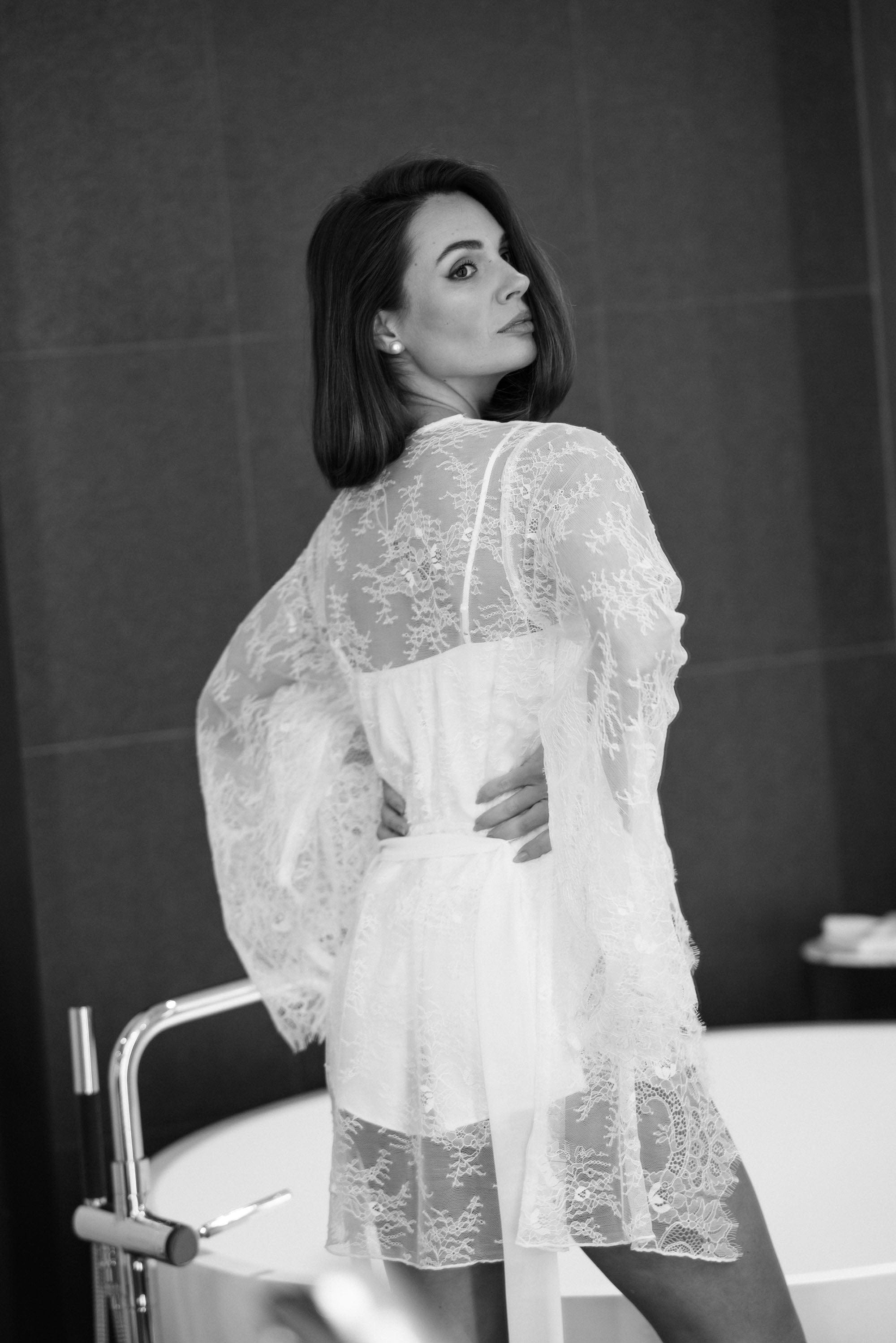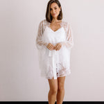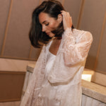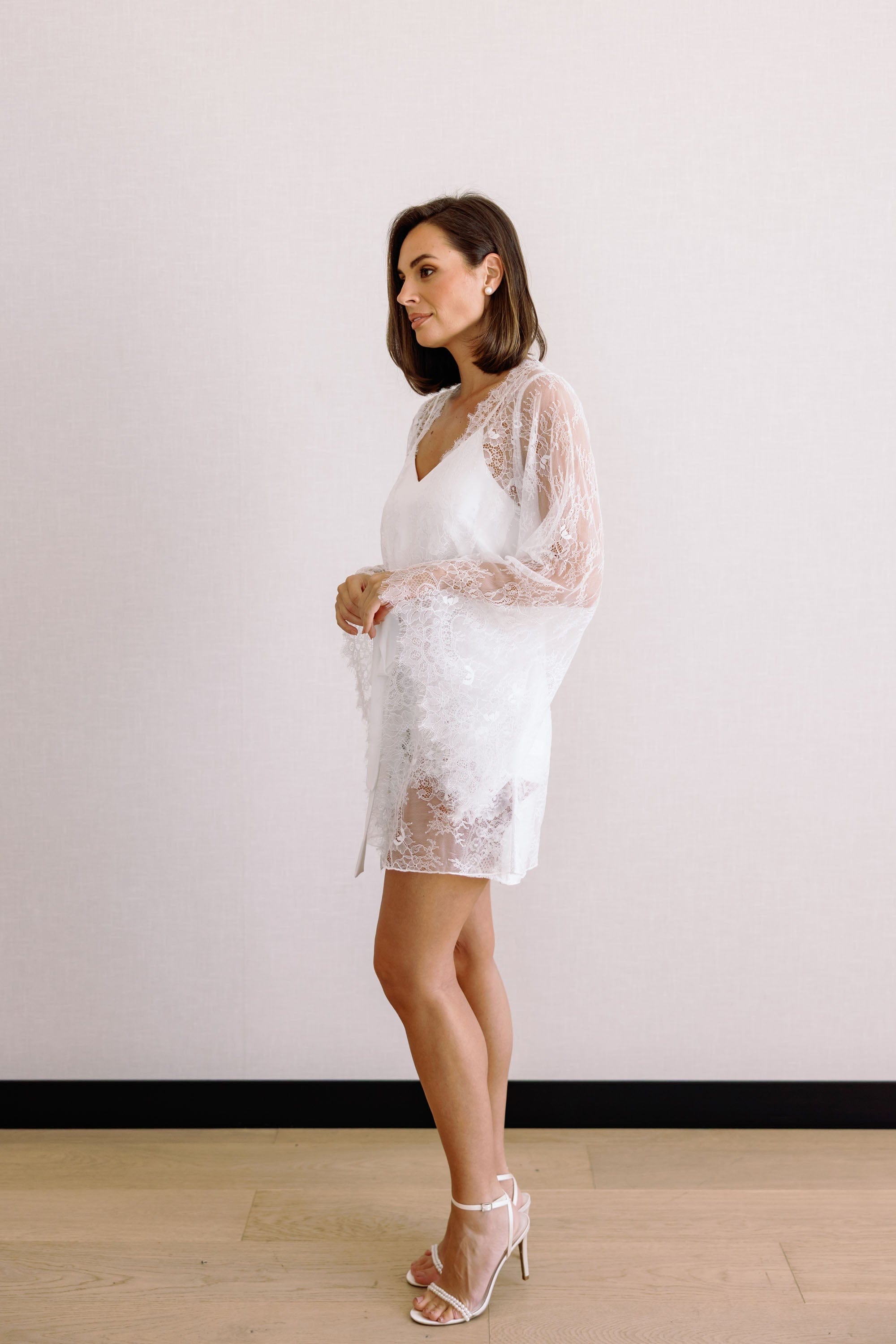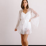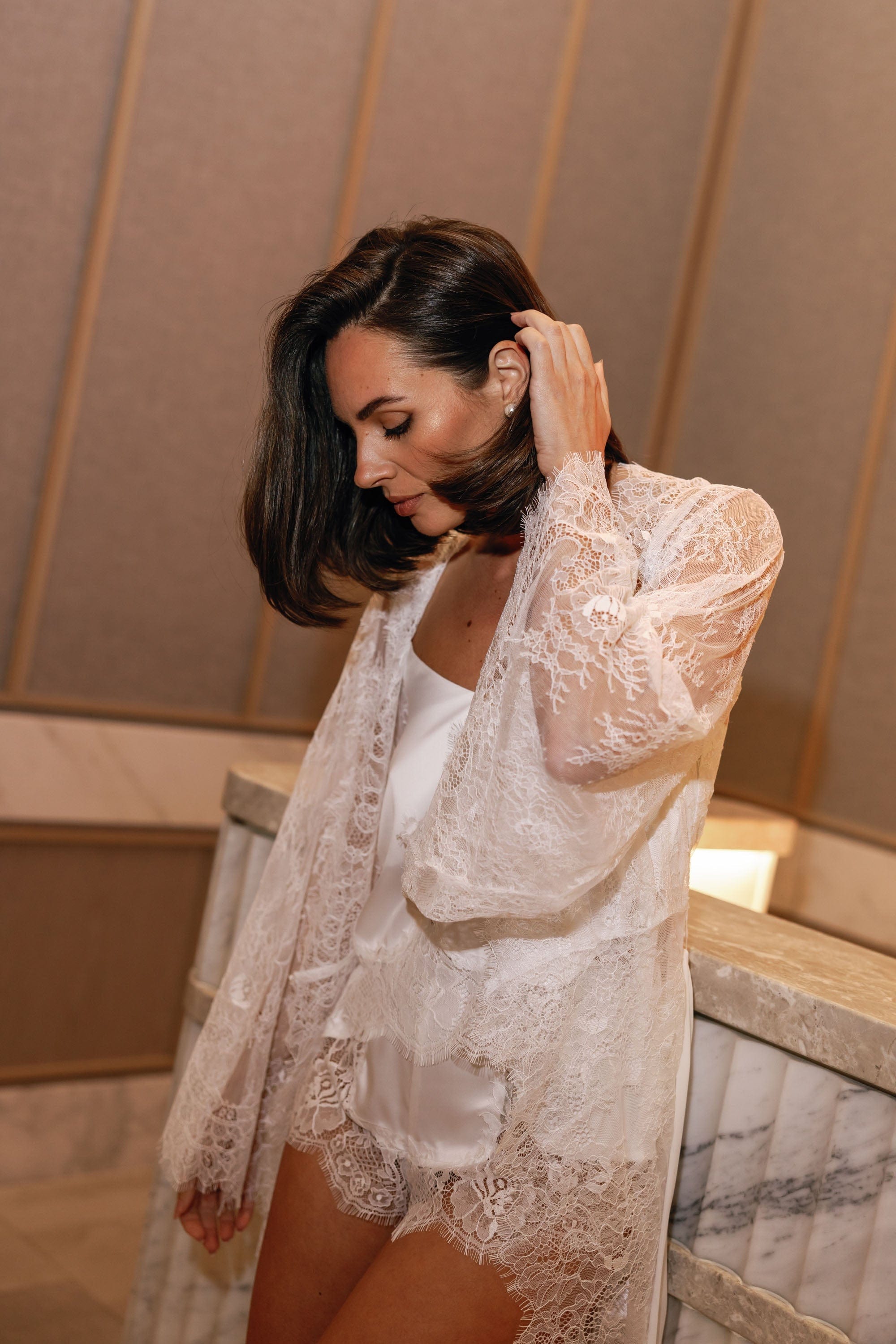 A Modern Classic in All-Over Lace. The Allegra Lace Robe is crafted entirely in soft, fine lace and framed by generous angel wing sleeves that fall effortlessly. The georgette waist tie defines the figure with a subtle cinch, lending this piece its graceful drape. Perfect for the contemporary bride who seeks a hint of allure while dressing or layering over fine lingerie.
