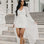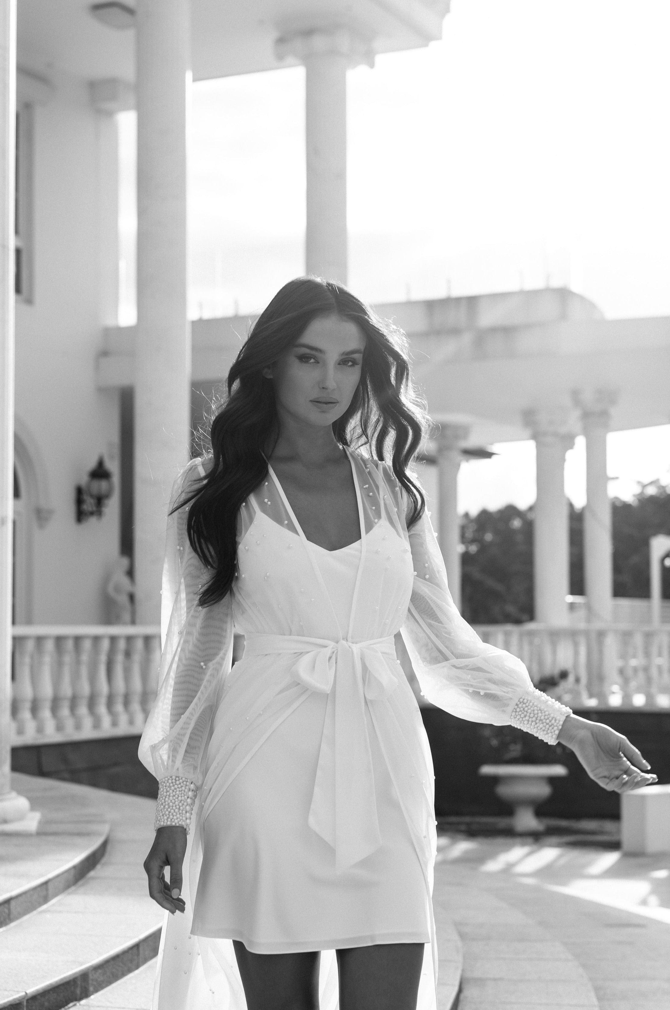 Made from our new soft mesh, it has natural stretch to create the perfect floating drape. Intricate hand beaded pearls enfold the cuff and are scattered across the rest of the robe.