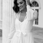 Ivy Pearl Beaded Maxi... made from our new oh so soft mesh and elaborately graced with hand beaded pearls completely covering the cuff and dappled across the entirety of the robe. Available in white. Pair with the Florence Hand Beaded Pearl Babydoll slip to complete your timeless bridal look.
